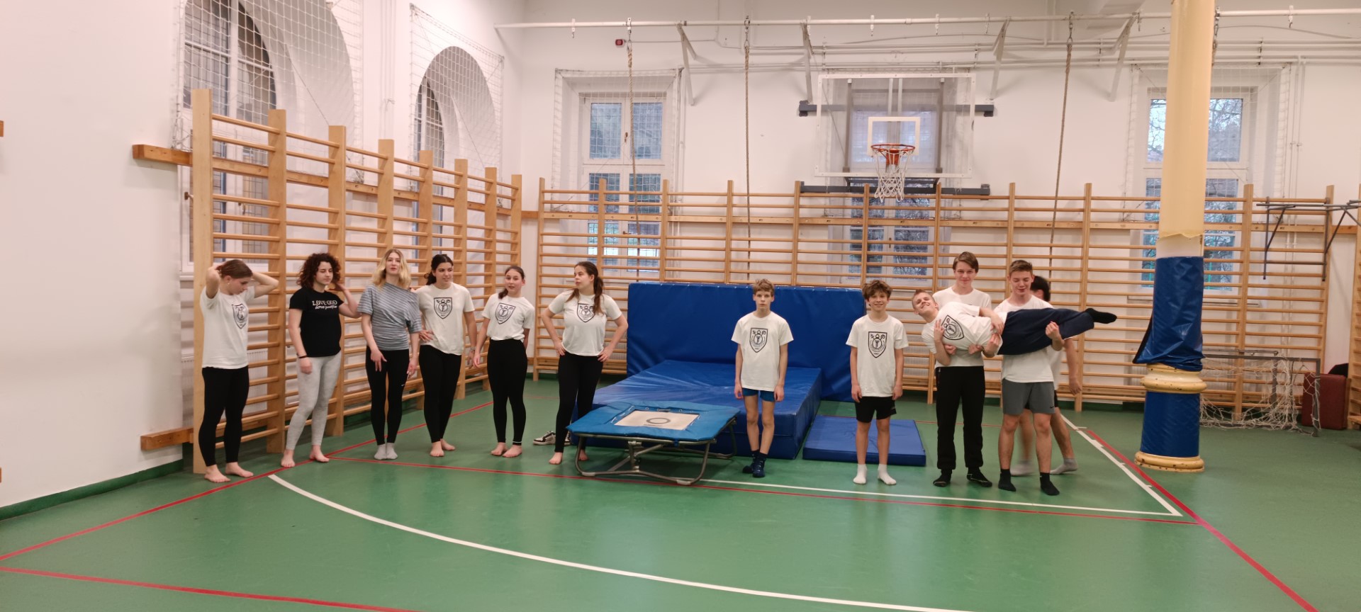 Kissé nehezített körülmény, hogy most kezdik felújítani a szertorna termet, így a bála és minitrampolin a folyosón foglal helyet, a verseny előtt a csapat bevonszolta a kellékeket a nagyterembe, ahol végül megrendeztük a versenyt!
