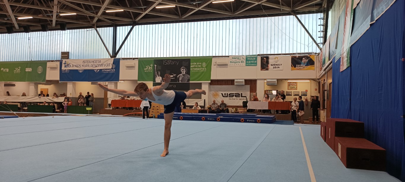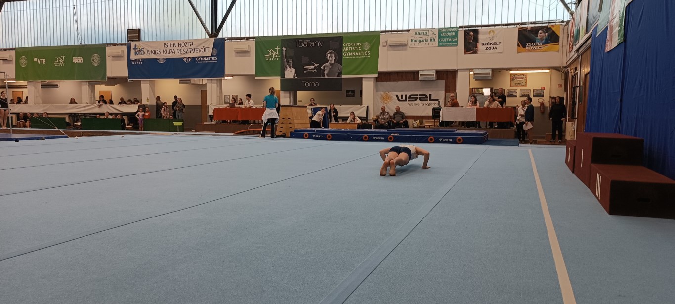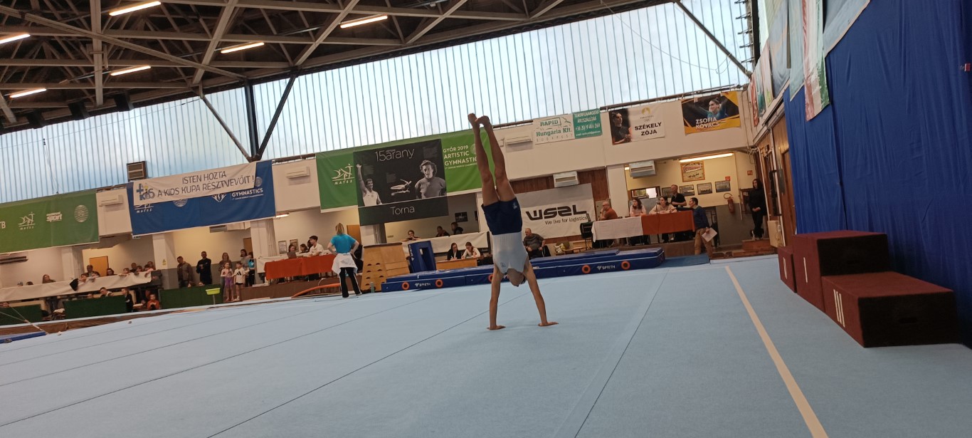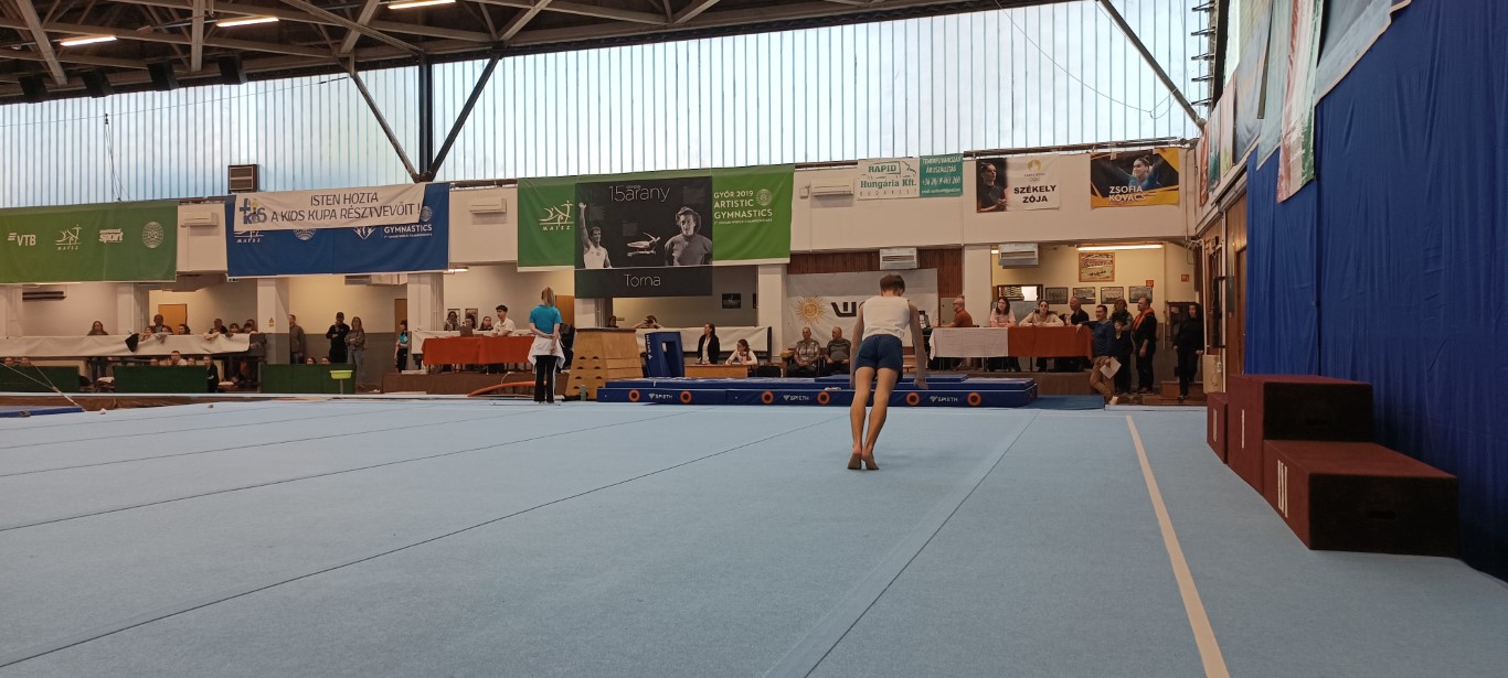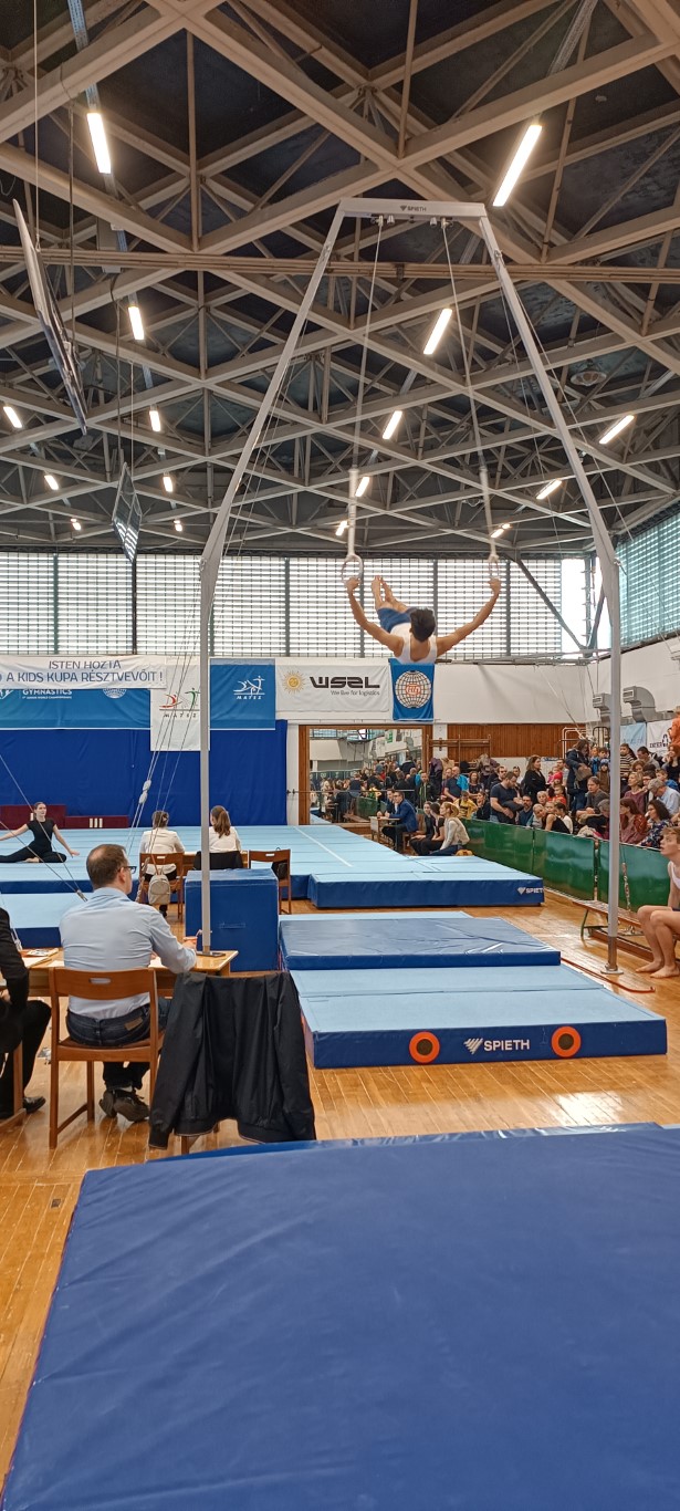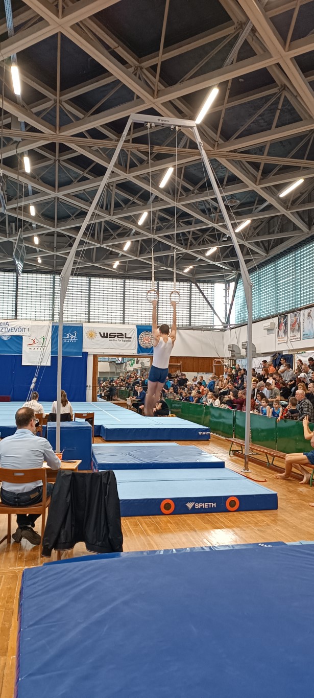 A versenyt a Torna Csarnokban rendezték, ahol van lehetőség nézőknek is megtekinteni gyermekeiket is. A nagyobbaknál ez kevésbé, kisebbeknél nagyon fontos mind a gyermek, mind a szülő részéről. Nálunk is kevés néző volt, de legalább kevésbé izgultak fiaink. 4 szeres a verseny talaj, gyűrű, szekrényugrás és korlát gyakorlatokat kell bemutatni. Ebben a korcsoportban bónusz lehetőség is van, alapgyakorlat mellett 1 vagy 2 nehezebb előírt elemet be lehet építeni a gyakorlatba. Fiaink nagyon ügyesen versenyeztek, csapatban 1. helyen végeztek, sőt szerenként bajnokságon ugráson Boti 3. helyezett lett, így 2 éremmel térhetett haza.